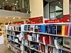 Bilde av skranke, bøker og penner ved Akademika UiT.